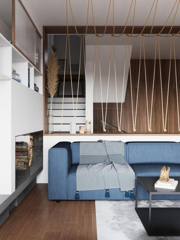 Trong phòng khách, một chiếc ghế sofa hiện đại màu xanh cộng với dây thừng kết theo dạng lưới, khiến ta liên tưởng đến cuộc sống của một ngư dân sống gần biển.