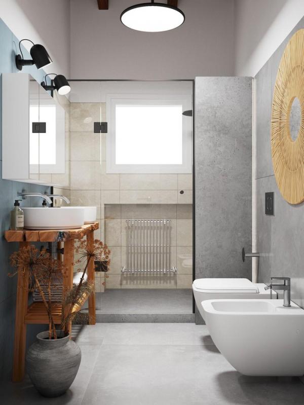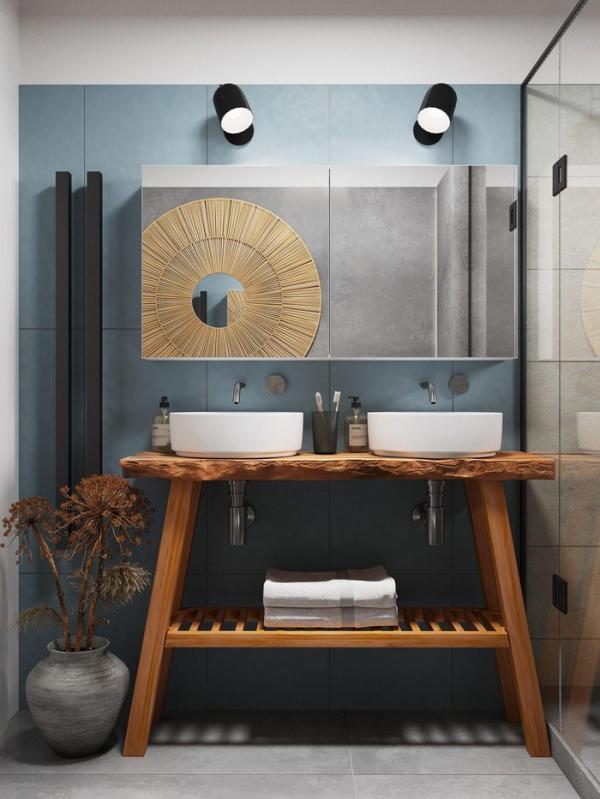 Kệ gỗ mang đến cảm giác bồng bềnh và nhẹ nhàng cho nhà tắm.