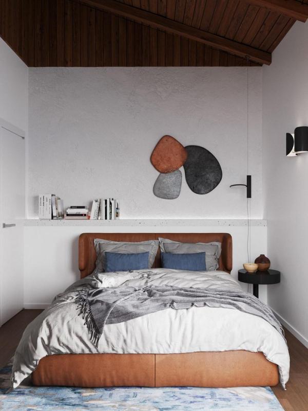 Chiếc giường ngủ bọc da mang lại màu sắc ấm cúng cho khu vực giường ngủ thứ 2. bức tranh đầu giường đẩy cao yếu tố nghệ thuật cho căn phòng.