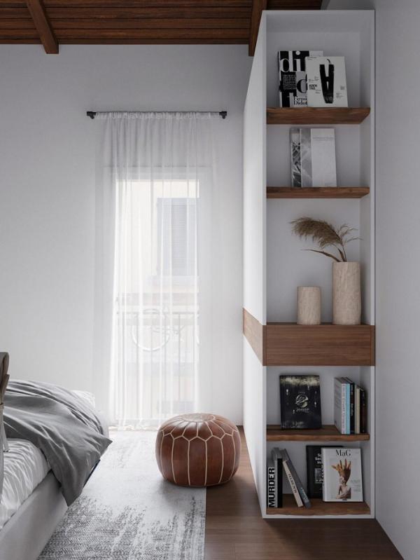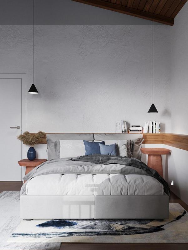 Kệ đầu giường và đèn khác độ cao tạo điểm nhấn cho khu vực phòng ngủ.