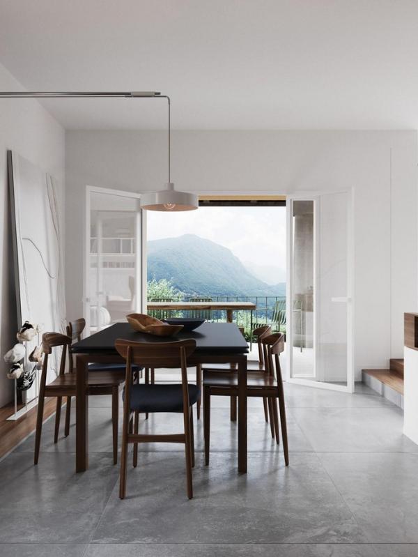 Bàn ăn đặt cạnh ban công hướng ra khung cảnh núi non tuyệt đẹp bên ngoài.