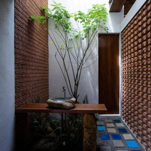 Một chậu rửa tay đặt ở khu vực giếng trời, tạo cảm giác gần gũi và kết nối.