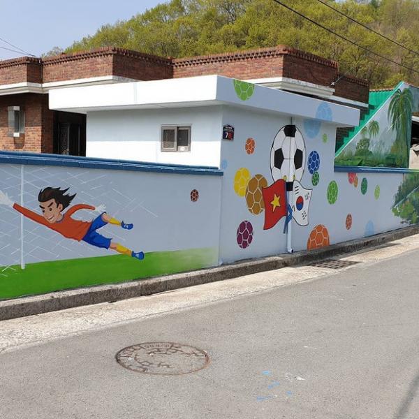 Theo đó, rất nhiều hình ảnh thi đấu của các cầu thủ Việt xuất hiện trong các bức tranh bích họa ở quê nhà HLV Park Hang Seo. Từng khoảnh khắc tại các giải đấu lớn của ĐT Việt Nam dưới sự chỉ đạo của vị chiến lược gia người Hàn Quốc đã được các họa sĩ tái hiện chi tiết đến từng màu áo, số áo.