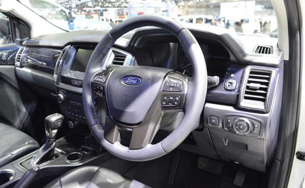 Bên trong nội thất, khoang lái của Ford Everest Sport nổi bật với ghế và táp-lô bọc da hoàn toàn cùng các đường chỉ thêu màu xanh.