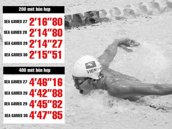 Tại sea games 30, Ánh Viên được đăng ký dự tranh 12 nội dung nhưng khi vào thi đấu đã bỏ bớt cự ly 100 m tự do nữ. Kết quả Ánh Viên vẫn là “máy sản xuất vàng” chủ lực nhưng về thành tích cá nhân thì đi xuống, trong đó có những nội dung kém với chính mình cả 1-2 giây.