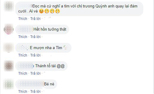 Siêu mẫu Xuân Lan “hết hồn” khi đọc được bài đăng của Tim. Dân mạng cũng thi nhau vào bình luận: “Rảnh ghê”, “Đính hôn trong phim hay ngoài đời ý anh ơi”, “Em còn tưởng thật đọc kỹ hết bài nữa chứ”, “Đọc đến dòng cuối cùng mới hiểu”, “Chờ nhau được không?”, “mất 20 giây cuộc đời”, “Đọc mà cứ nghĩ anh Tim với chị Trương Quỳnh Anh quay lại đám cưới. Ai dè”…