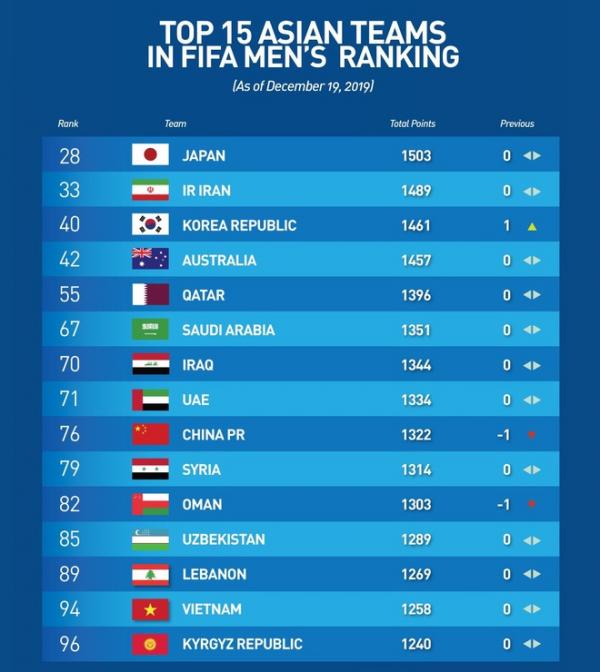 Cũng theo bảng xếp hạng FIFA cuối cùng của năm 2019, tuyển Việt Nam giữ nguyên hạng 94 thế giới, xếp thứ 14 châu Á và dẫn đầu khu vực Đông Nam Á.