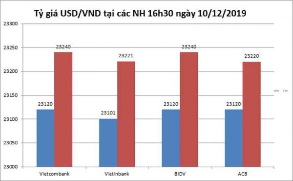 Tới cuối phiên 10/12, Vietcombank và BIDV niêm yết tỷ giá ở mức: 23.120 đồng/USD và 23.240 đồng/USD. Vietinbank: 23.101 đồng/USD và 24.221 đồng/USD. ACB: 23.120 đồng/USD và 23.220 đồng/USD.