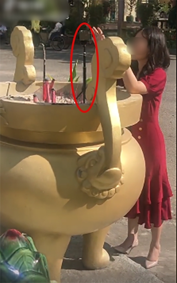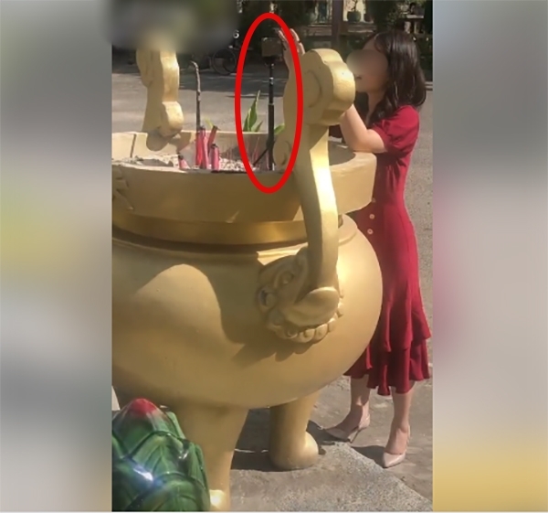 Chẳng hạn, mới đây, một đoạn clip ngắn ghi lại hình ảnh một cô gái trẻ mặc váy đỏ thản nhiên cắm cây gậy chụp ảnh vào chiếc lư hương đặt trước sân đình nhằm lưu lại khoảnh khắc cả nhà đang đi lễ chùa.