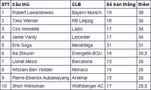 Top 10 ứng viên trong cuộc đua chiếc giày Vàng châu Âu mùa này