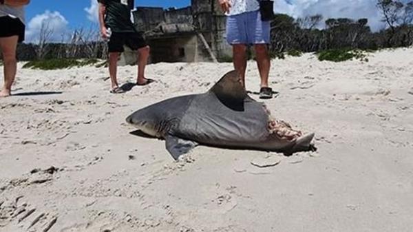 thi thể chỉ trơ lại nửa phần trên của con vật đã dấy lên mối lo ngại quần thể cá mập tự tàn sát và ăn thịt lẫn nhau trên biển. Có vẻ con cá mập bò đã bị đồng loại tấn công, cắn đứt nửa người dưới trước khi theo con sóng dạt vào đảo Bribie, Australia.