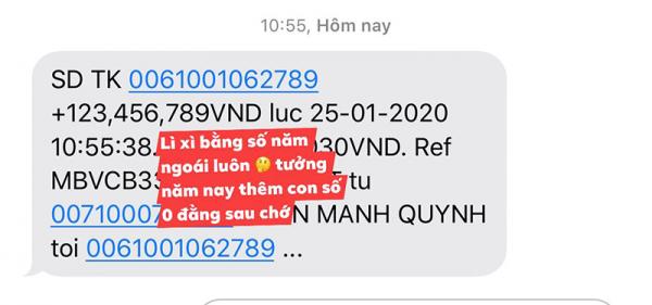 Được Phan Mạnh Quỳnh chuyển khoản 123,456,789 đồng mừng tuổi, Khánh Vy không giấu nổi vui sướng. hot girl 9X cũng tiết lộ thêm, năm ngoái nam ca sĩ cũng mừng tuổi cô với số tiền y hệt.