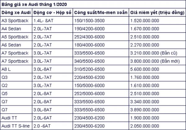 Dưới đây là bảng giá xe Audi mới nhất tháng 1/2020 để bạn đọc tham khảo: