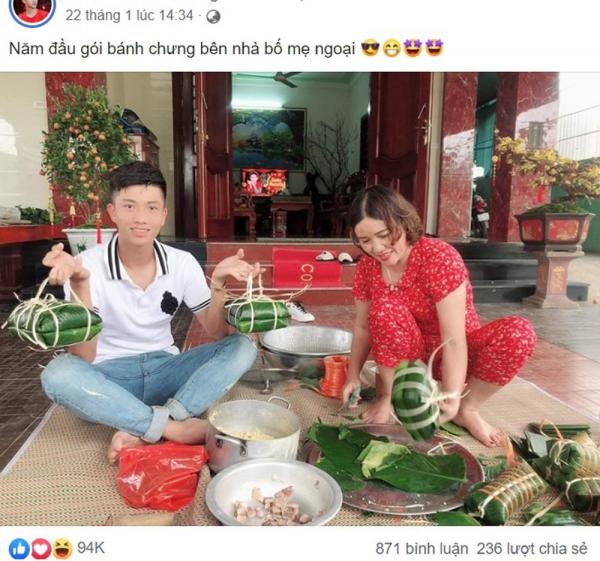 Trước Tết Nguyên đán, nam cầu thủ cũng khiến người hâm mộ đồng loạt thả tim khi đăng ảnh gói bánh chưng ở nhà vợ tương lai. Anh viết: ‘Năm đầu gói bánh chưng bên nhà bố mẹ ngoại’.