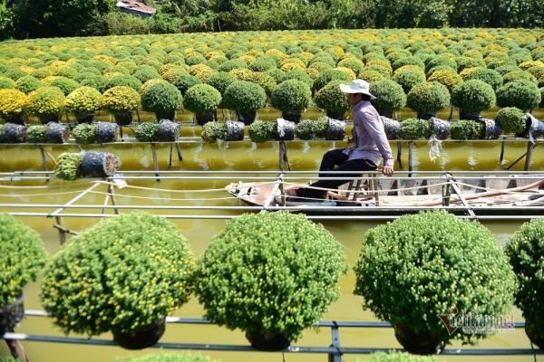 Để chăm sóc hoa, người dân dùng xuồng nhỏ hoặc lội dưới nước. Người trồng hoa cho biết, thời tiết cuối năm ở Nam Bộ là mùa khô, nắng nhiều...