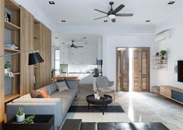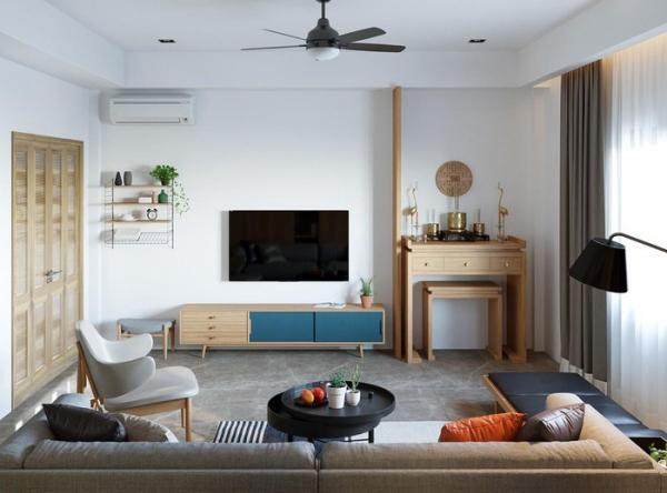 Bên cạnh máy điều hòa, chủ nhân còn sử dụng thêm quạt trần vào những hôm trời mát. Một ban thờ đặt cạnh phòng khách là nơi gia chủ tưởng nhớ về cội nguồn, tổ tiên.
