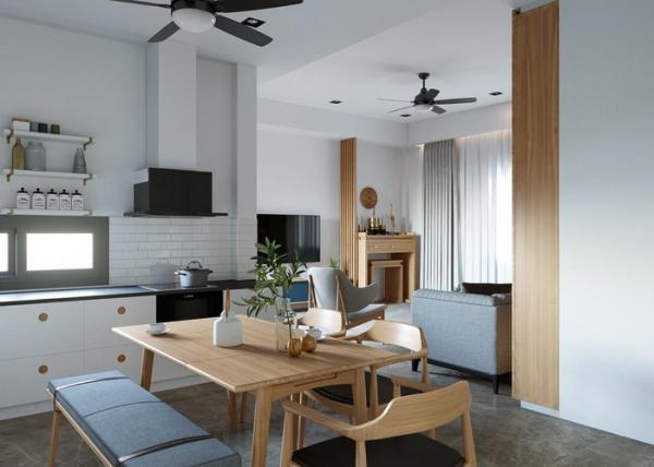 Bàn ghế ăn làm bằng gỗ, mang đến cảm giác ấm cúng, giản dị, phù hợp với tính cách của chủ sở hữu.