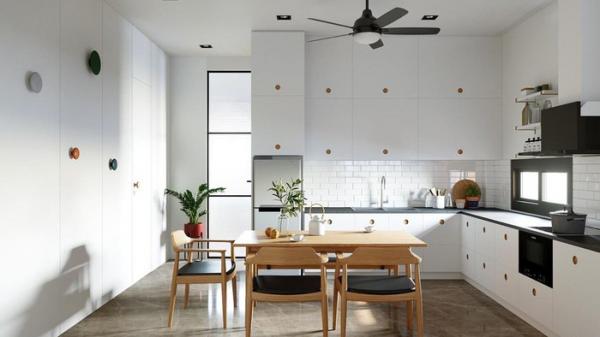 Tủ bếp màu trắng, hình chữ L xếp chồng lên nhau kết hợp với tay nắm bằng gỗ độc đáo.