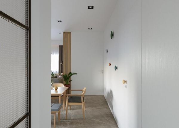 Móc treo tường màu sắc đặt cạnh lối vào, dùng để treo áo khoác đi nắng.
