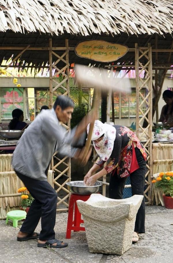Hình ảnh quết bánh phồng đang được phục dựng lại tại các sự kiện du lịch: Ảnh: Lý Hồng Vân.