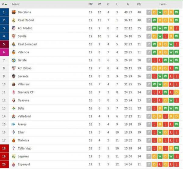 Bảng xếp hạng La Liga sau lượt trận ngày 4/1.