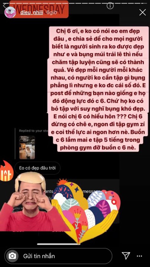 Theo đó, tài khoản này đã "body Shaming" vòng 2 của Diệu Nhi với lời nói: "Eo có đẹp đâu trời". Lập tức, cô nàng đã tỏ thái độ đáp trả quyết liệt ngay: "Em không nói là eo em đẹp đâu, em chia sẻ lên để cho mọi người biết là người sinh ra không được đẹp như em và bụng múi trái lê thì nếu chăm tập luyện cũng sẽ có thành quả.