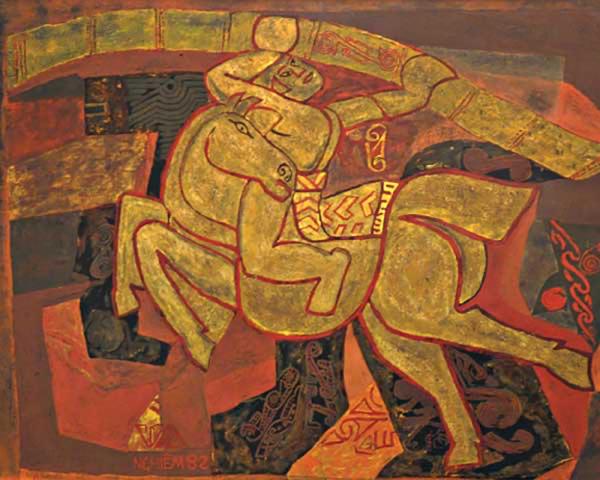 Bức tranh Gióng (1990) của tác giả Nguyễn Tư Nghiêm (1922 - 2016), chất liệu sơn mài, kích thước 90 x 120,3 cm. Ảnh: Kiều Dương.