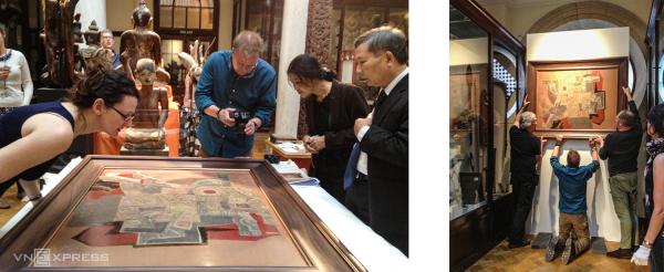 Các chuyên gia thẩm định và treo tranh tại MAA dưới sự chứng kiến của các chuyên gia hai nước. Ảnh tư liệu: VNFAM.