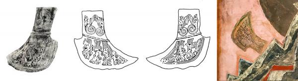 Phần lưỡi rìu trong tranh tượng trưng cho công cụ lao động của người xưa. Chi tiết này được cho là đã có sự gạn lọc, mang dụng ý nói về hoạt động lao động sản xuất, mưu cầu cuộc sống ấm no sau khi chiến tranh qua đi thay vì biểu hiện những vũ khí như dao găm, mũi giáo.