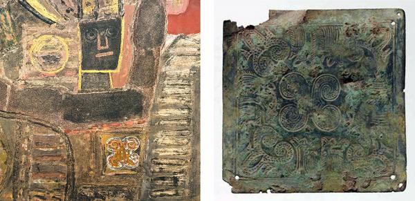 Cùng với đó là các họa tiết tiêu biểu thời Đông Sơn trên miếng hộ tâm (giáp ngực) của chiến binh, hình giao long kết đôi biểu trưng của tín ngưỡng phồn thực, vạn vật sinh sôi nảy nở.