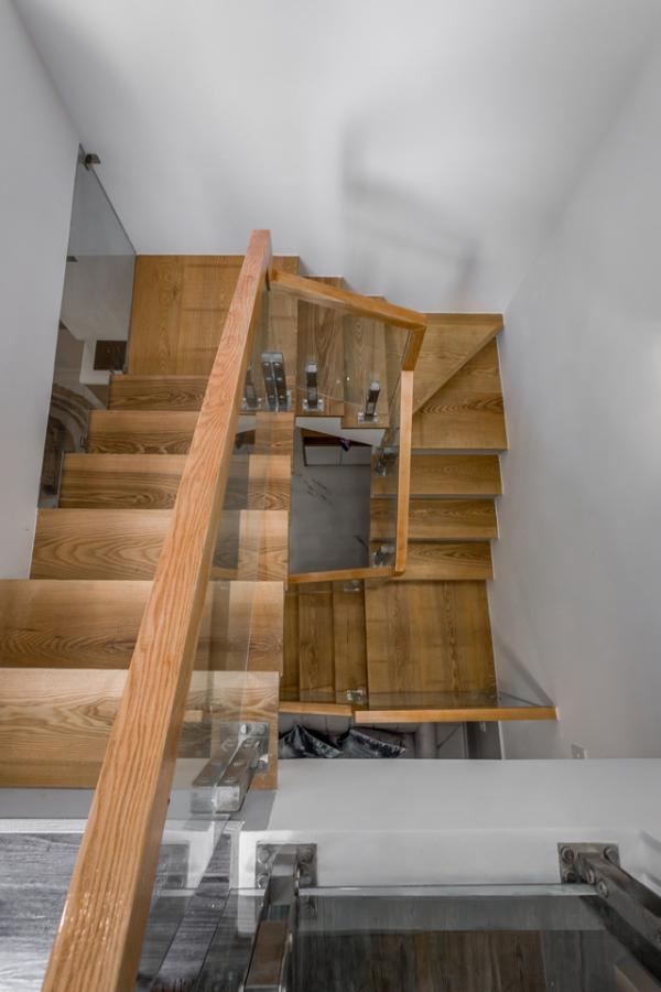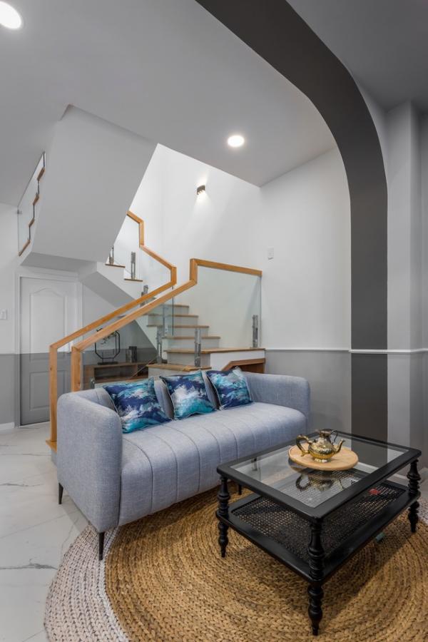 Thành cầu thang được thay bằng kính cường lực mang lại sự tinh tế, hiện đại nhưng vẫn chắc chắn, an toàn, đồng thời có tích hợp kệ để giày dép nhằm tiết kiệm không gian