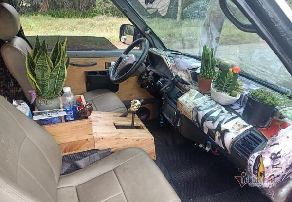 Phần nội bên trong xe được ốp gỗ thông pallet gần như hoàn toàn