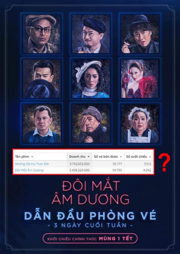 Trước đó, phim Đôi mắt âm dương cũng vấp phải nghi vấn thổi phồng con số doanh thu. Cụ thể, theo số liệu trên Box Office Vietnam, ở top phim chiếu cuối tuần, Đôi mắt âm dương chỉ đứng thứ hai với doanh thu 5,4 tỉ đồng, xếp sau phim Mỹ Những gã trai hư trọn đời (Bad Boys for Life) của ngôi sao Will Smith với 5,7 tỉ đồng. Trong khi đó, nhà sản xuất Đôi mắt âm dương lại tuyên bố phim có doanh thu đứng đầu. Sự việc này khiến nhiều khán giả hoài nghi về sự chân thực doanh thu và cho là chiêu PR của phim.