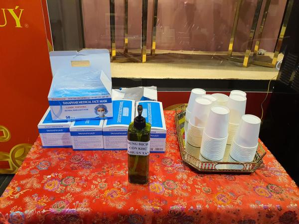 Khẩu trang và dung dịch sát khuẩn được chuẩn bị sẵn cho khách hàng. (Ảnh: Ngọc Lâm)