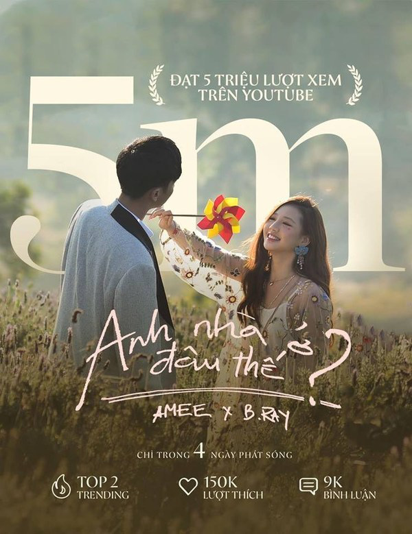Trong năm 2019 vừa qua, ca sĩ trẻ sinh năm 2000 Amee vụt sáng như một hiện tượng với bài hit Anh nhà ở đâu thế. MV của ca khúc đã đạt tới hơn 95 triệu lượt view trên Youtube, vượt qua rất nhiều ca sĩ kỳ cựu khác.