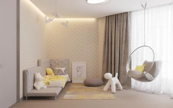 Một chiếc ghế hình bong bóng, treo lơ lửng trên trần nhà tạo nên một chiếc xích đu đáng yêu trong phòng của đứa trẻ.