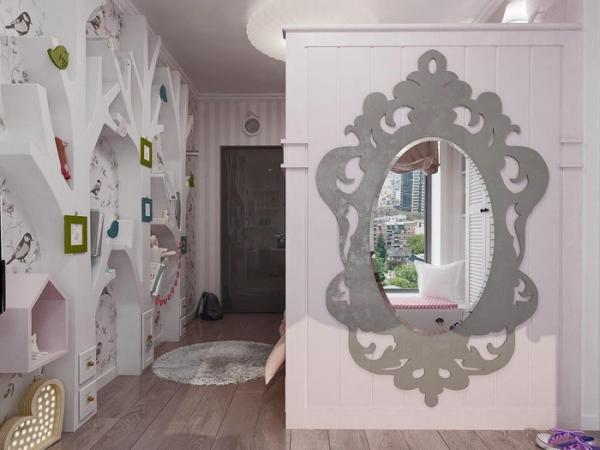 Giá sách hình thân cây cùng chiếc gương treo tường tạo nên sự khác biệt cho phòng ngủ trẻ em.