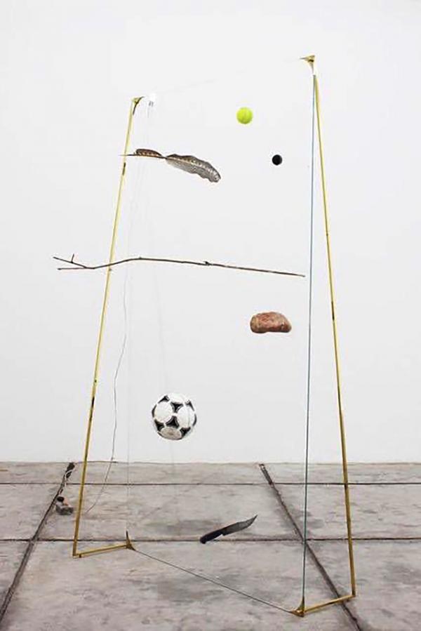 Sắp đặt nghệ thuật này bao gồm một tấm kính, một viên đá, một trái bóng và một số đồ vật ngẫu nhiên khác… được đặt xuyên qua tấm kính. Trong số những món đồ được đưa vào sắp đặt nghệ thuật lần này, có những món do con người sản xuất ra như trái bóng tennis, trái bóng da, hay những thứ được tìm thấy trong tự nhiên như viên đá, cành cây...