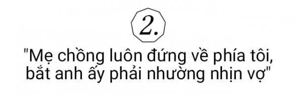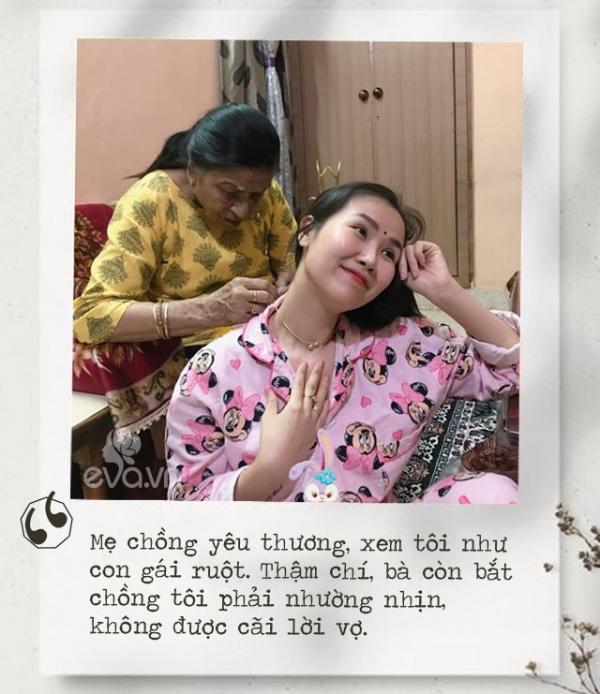 Không phải chỉ mẹ chồng tôi, mà tất cả những người mẹ đều sẽ hỏi người chung sống cùng con họ như vậy. Bà cũng thường hỏi ông xã tôi về việc sẽ làm gì cho tôi được hạnh phúc. Tôi nghĩ thời điểm này mình được bù đắp nhiều khi chính mẹ chồng cũng rất yêu thương, xem tôi như con gái ruột. Thậm chí, bà còn bắt chồng tôi phải nhường nhịn, không được cãi lời vợ. Bà luôn đứng về phía tôi trong mọi việc. Khi hai vợ chồng tranh luận thì mẹ sẽ ra tín hiệu cho anh ấy nên dừng lại.