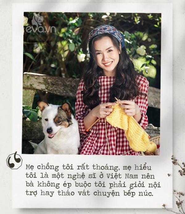 Tôi nghĩ mình may mắn, vì ở đất nước nào cũng sẽ có chuyện mẹ chồng - nàng dâu không hoà thuận, và sẽ có nhiều gia đình vẫn giữ nếp truyền thống khi con dâu về nhà chồng. Mẹ chồng tôi rất thoáng, mẹ hiểu tôi là một nghệ sĩ ở Việt Nam nên bà không ép buộc tôi phải giỏi nội trợ hay tháo vát chuyện bếp núc. Khi về nhà chồng, bà không bắt tôi làm gì cả.