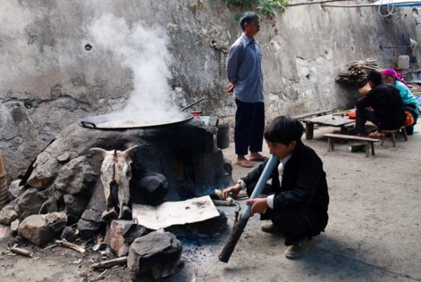 Ông Tráng A Vu đang nấu ba nồi thắng cố cho kịp phục vụ thực khách.