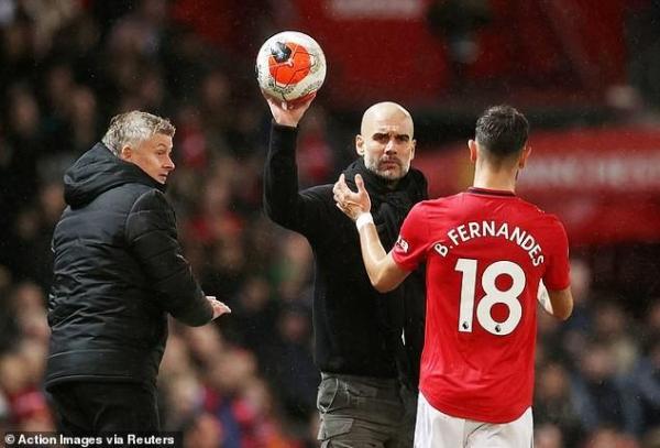 Trong một tình huống bóng chết khi United đang dẫn bàn, Guardiola tỏ ra không hài lòng với sự thiếu khẩn cấp khi những nhân viên nhặt bóng cứ từ từ mà đưa bóng vào cuộc.