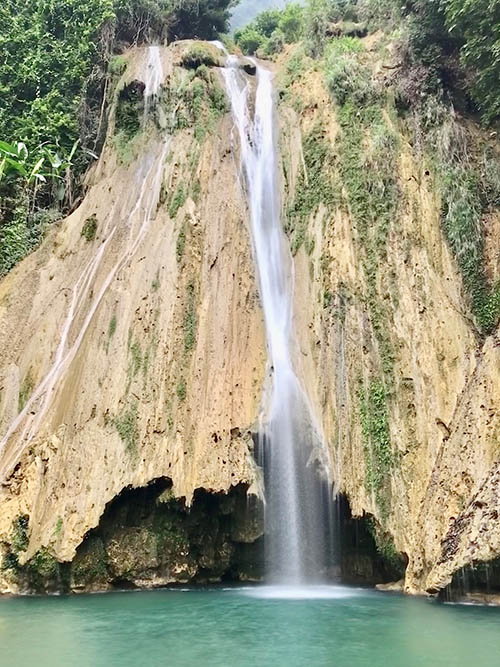 Thật vậy, sau khoảng 30 phút leo dốc, hiện ra trước mắt chúng tôi là dòng thác trắng như dải lụa đổ từ độ cao hàng chục mét. Đẹp nhất là phần nước rủ xuống hồ nước dưới chân thác trông như tấm màn che ẩn giấu hang bí mật bên trong.
