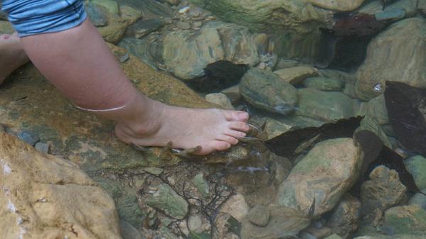 Theo tình nguyện viên ở đây, vào mùa hè, hồ nước tự nhiên này có rất đông người tới tắm. Ngày chúng tôi tới nước khá lạnh nhưng bù lại là trải nghiệm có một không hai: massage cá. Những con cá nhỏ chỉ bằng ngón tay sống quanh mép hồ, chỉ cần có người bước chân xuống nước là chúng thi nhau rỉa, tạo cảm giác tê tê, buồn buồn.