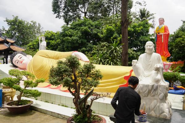 Nhìn từ phía cổng chùa vào, nổi bật là pho tượng Phật nằm dài khoảng 10 m.