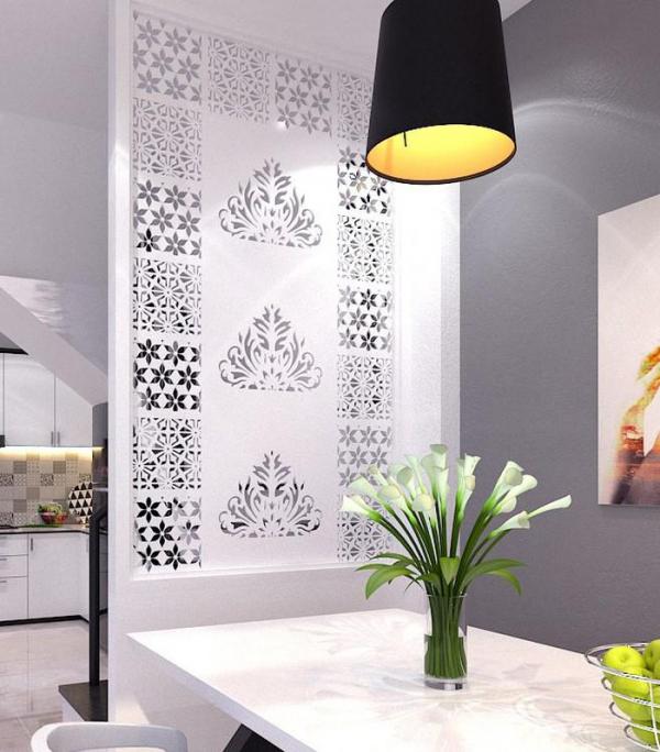 bức tường ngăn giữa phòng khách và nhà bếp cắt bằng phương pháp cnc, có họa tiết tinh tế.