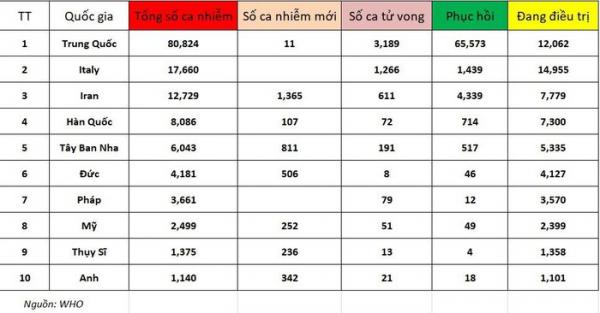 Hàn Quốc số ca nhiễm là 8.086, tử vong 72, số ca nhiễm mới trong ngày là 107. Tây Ban Nha có số ca nhiễm là 6.043, tử vong 191, số ca nhiễm mới trong ngày tới 811. Đức có số ca nhiễm là 4.181, tử vong 8, số ca nhiễm mới trong ngày 505.