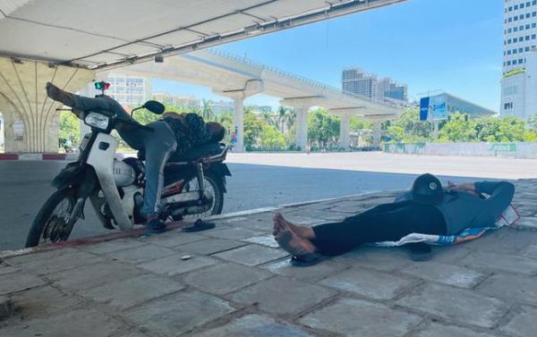 Người lao động chợp mắt trưa 19/6 dưới gầm cầu vượt, trong cái nắng nóng gay gắt trên 40 độ C. Ảnh: Phan Dương.