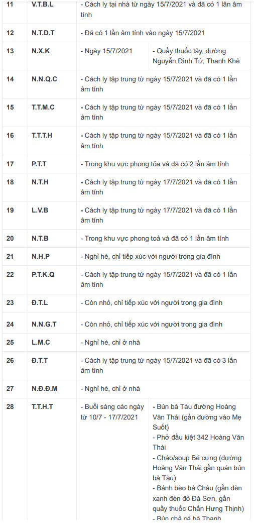 Chuỗi lây nhiễm liên quan đến bệnh nhân V.H.B (phường Hòa Xuân, quận Cẩm Lệ) trong ngày 19-7 ghi nhận thêm 5 ca mắc mới, là những F1 đã được cách ly. Ngoài ra, 5 trường hợp khác là F1 liên quan đến chuỗi lây nhiễm của bệnh nhân N.T.T.T (phường An Khê, quận Thanh Khê) được cách ly tập trung cũng xác định dương tính với SARS-CoV-2 trong đợt này.