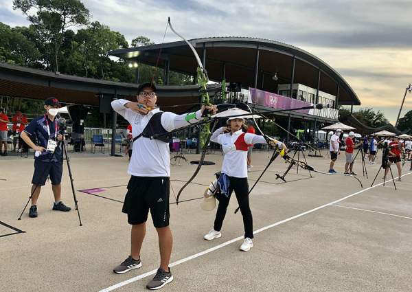 Hai VĐV đội tuyển bắn cung tập luyện ở nội dung cung 1 dây và cung 3 dây